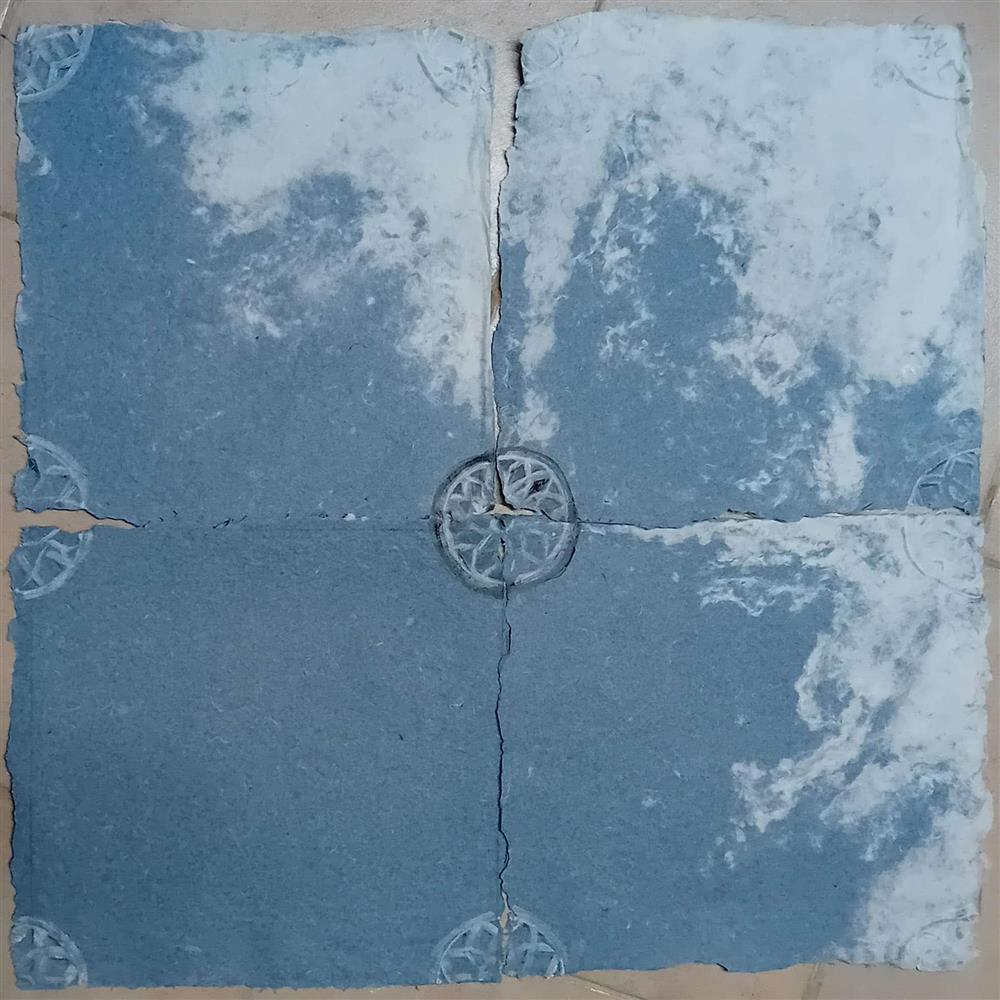 The concept behind, Elizabeth's latest exhibition in Macau is the product of hours of work on and around her Macanese studio table, inlaid with hand-painted blue and white Chinese porcelain created for the export market and brought by Americans to Hong Kong. She traced the porcelain's intricate designs, recalling Portuguese cobalt tiles in Macau's public spaces and the ways that the artform links disparate cultures, from China to the west. These blues are the art of empires, which, like paper and denim, have been interwoven across continents and centuries through migration, trade, power and conflict, transformed by people at every level of society as they have been incorporated into their lives. What particularly interested Briel were the cultural interactions between Chinese empires, Mediterranean caliphates and Iberian powers that catalysed the artistic media of paper and blue-and-white porcelain during the past millennium.